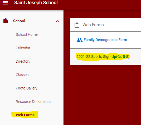 Family Portal - login, click on WebForms and click on the 2021-22 Sports Sign-Up