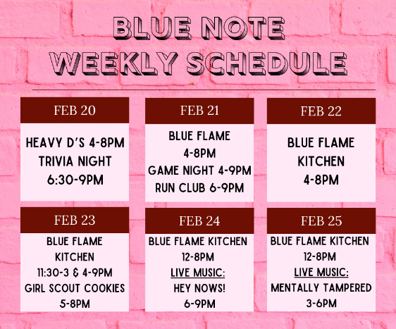1/19, 11:30-10 p.m.: It’s Friday, we made it to the weekend! Treat yourself to a great time with us at Blue Note. Blue Flame is open 11:30 a.m.-3 p.m. & 4-9 p.m.