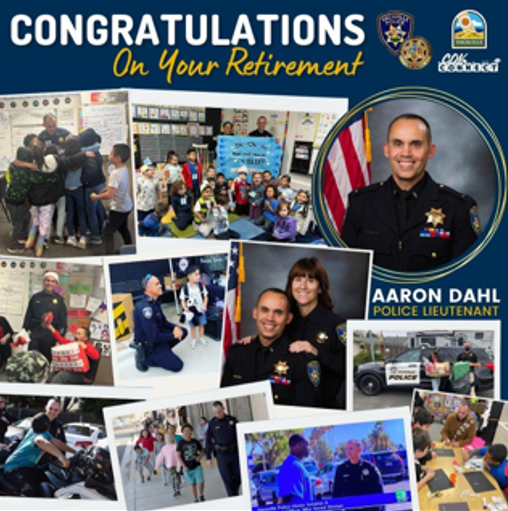 Congratulations to Lieutenant Aaron Dahl on his much-deserved retirement. Following a brief stint with BART Police Department beginning in 1998, Lieutenant Dahl transferred to the City of Vacaville Police Department in 2002.