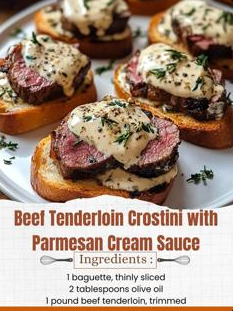 Beef Tenderloin Crostini with Parmesan Cream Sauce