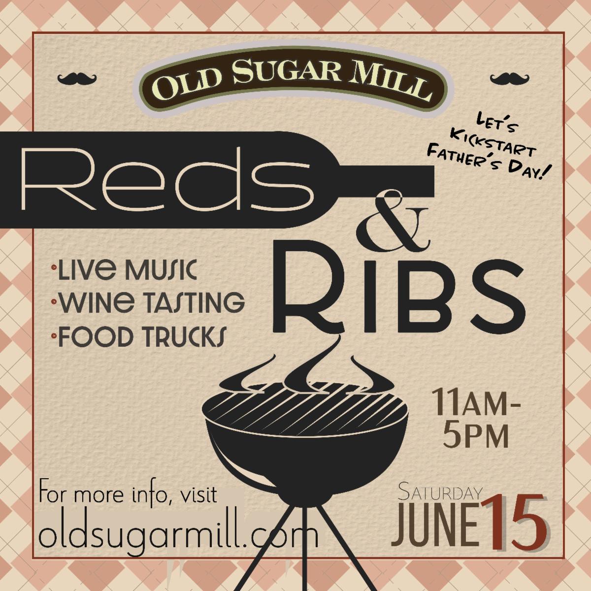 Come join us for a fun-filled Father’s Day “Pre” Celebration at the Old Sugar Mill on June 15! Treat your Dad to a day of delicious food, live music, and great company. Show your Dad, Grandpa, Brother, or Bro how much you appreciate him by spending quality time together in a beautiful setting. Don’t miss out on this opportunity to create lasting memories with your Dad before the official Father’s Day. Let’s celebrate Dads in style as you toast with some Red Wine & Ribs.