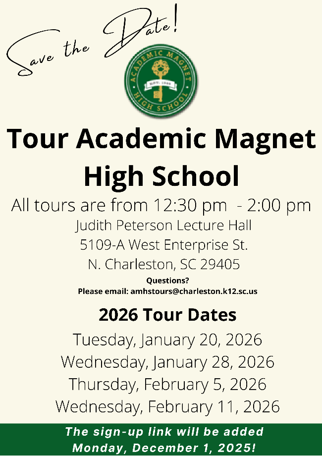 | | Click here for Resume Tips! | | Click here for Interview Tips! | | SAVE THE DATE! CCSD has set graduation dates for 2026 and our AMHS seniors will walk across the stage on Friday, May 29, 2026, at 3 pm. Graduation will be held at the North Charleston Performing Arts Center. | | |