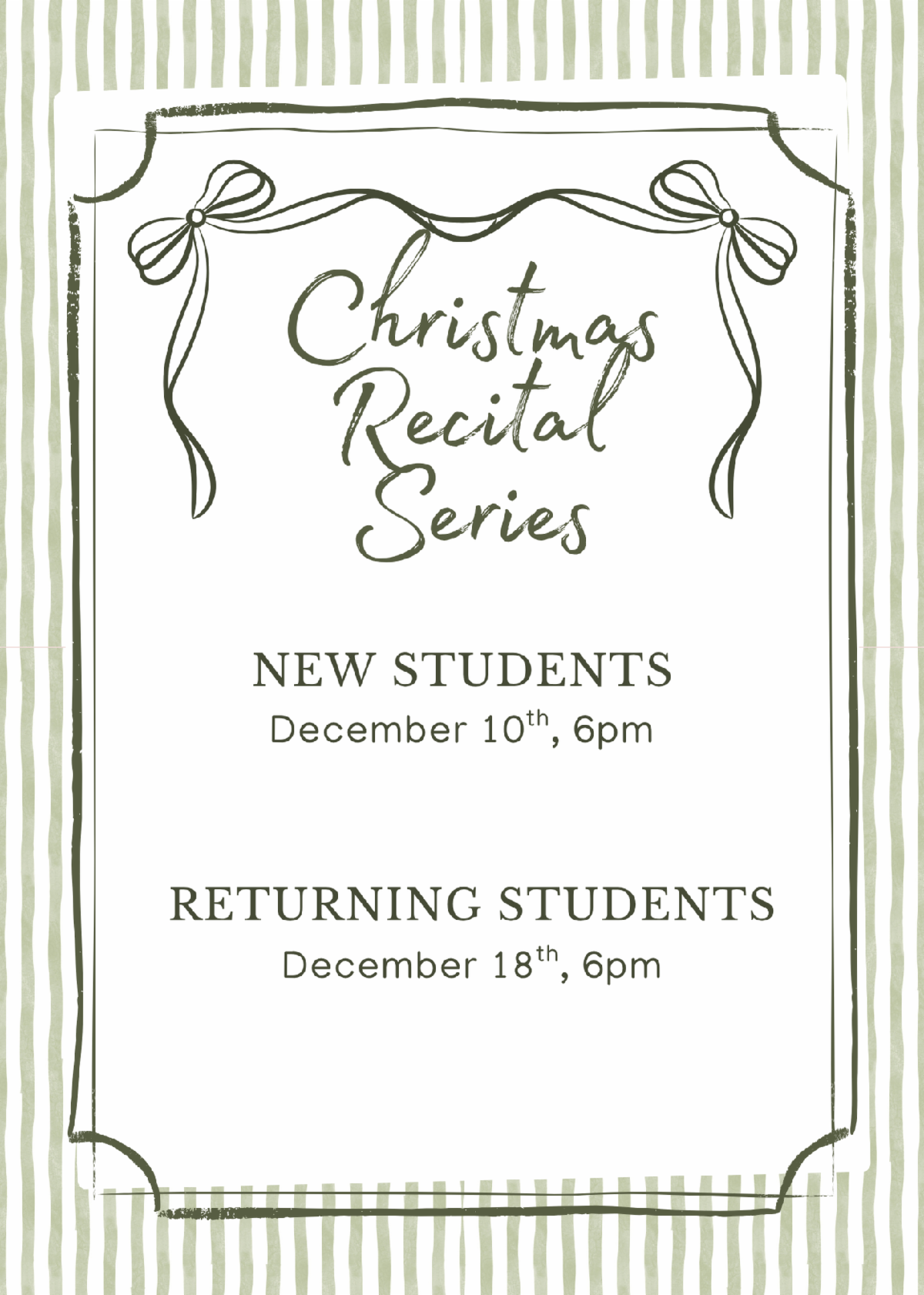 Thursday, December 18 at 6:00pm: Christmas Piano Recital for returning students in the church.