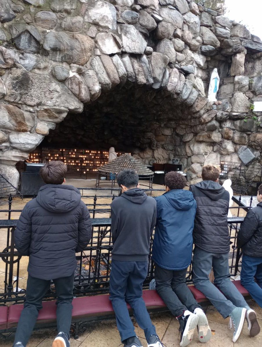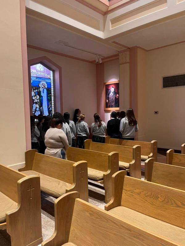 What a great day! The boys were able to visit the Basilica of the Sacred Heart at Notre Dame-home to over 1600 relics. We visited the grotto to pray. A former pastor, Father Andrew, walked with us for the first hour of our visit! Father Carl, a Holy Cross priest, gave us the history of the Log Chapel, the first building built at Notre Dame and the burial place of the first ordained priest in America-Father Stephen Theodore Badin. He also shared his vocation story. Our final stop was the Hesburgh Library. Ivan Miranda, our Notre Dame guide, told us about the Word of Life mural (touchdown Jesus). | | | | 8th Grade Girls to St. Francis Convent | |