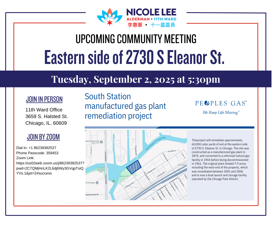 On Tuesday, we will have a community meeting regarding the remediation of a piece of land on the east side of Park #571 / the Eleanor Street boathouse, at 2730 S Eleanor St. This land is a former People’s Gas manufactured gas plant. We are in early stages with this project, but this would be a great area to make into more green space along the river. The hybrid meeting will take place Tuesday, September 2, 5:30 PM, in person at the ward office or online via zoom, see below for full details.