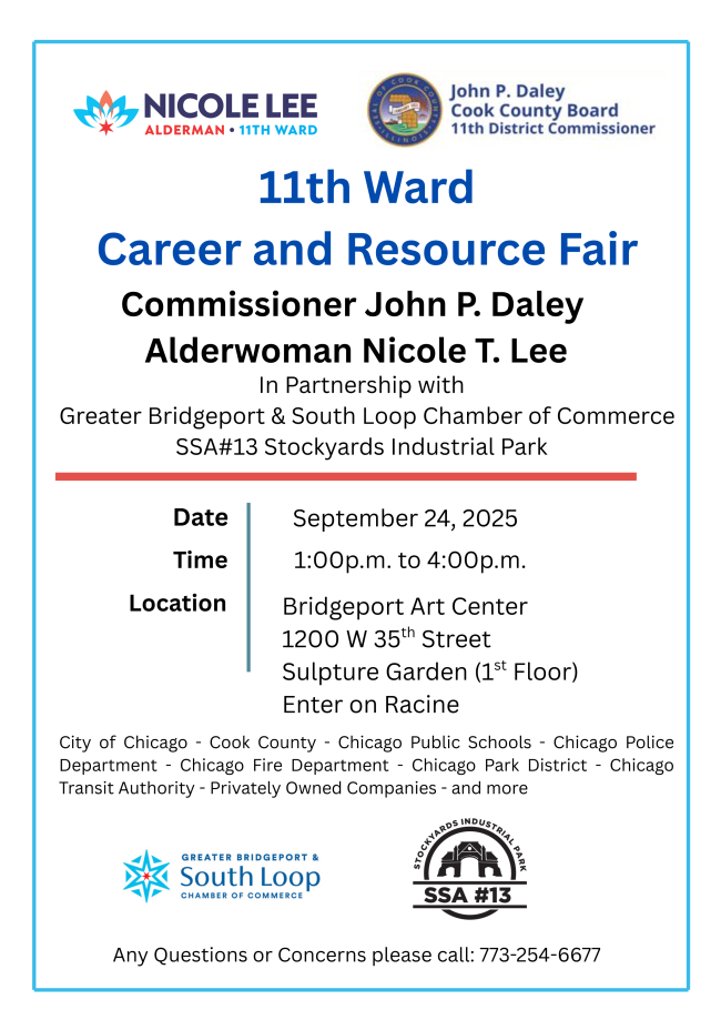 A reminder to get ready for the 11th Ward Career and Resource Fair on September 24 at the Bridgeport Art Center, brought to you by my office, Commissioner John P. Daley, SSA #13, the Greater Bridgeport and South Loop Chamber of Commerce, and many great local employers.