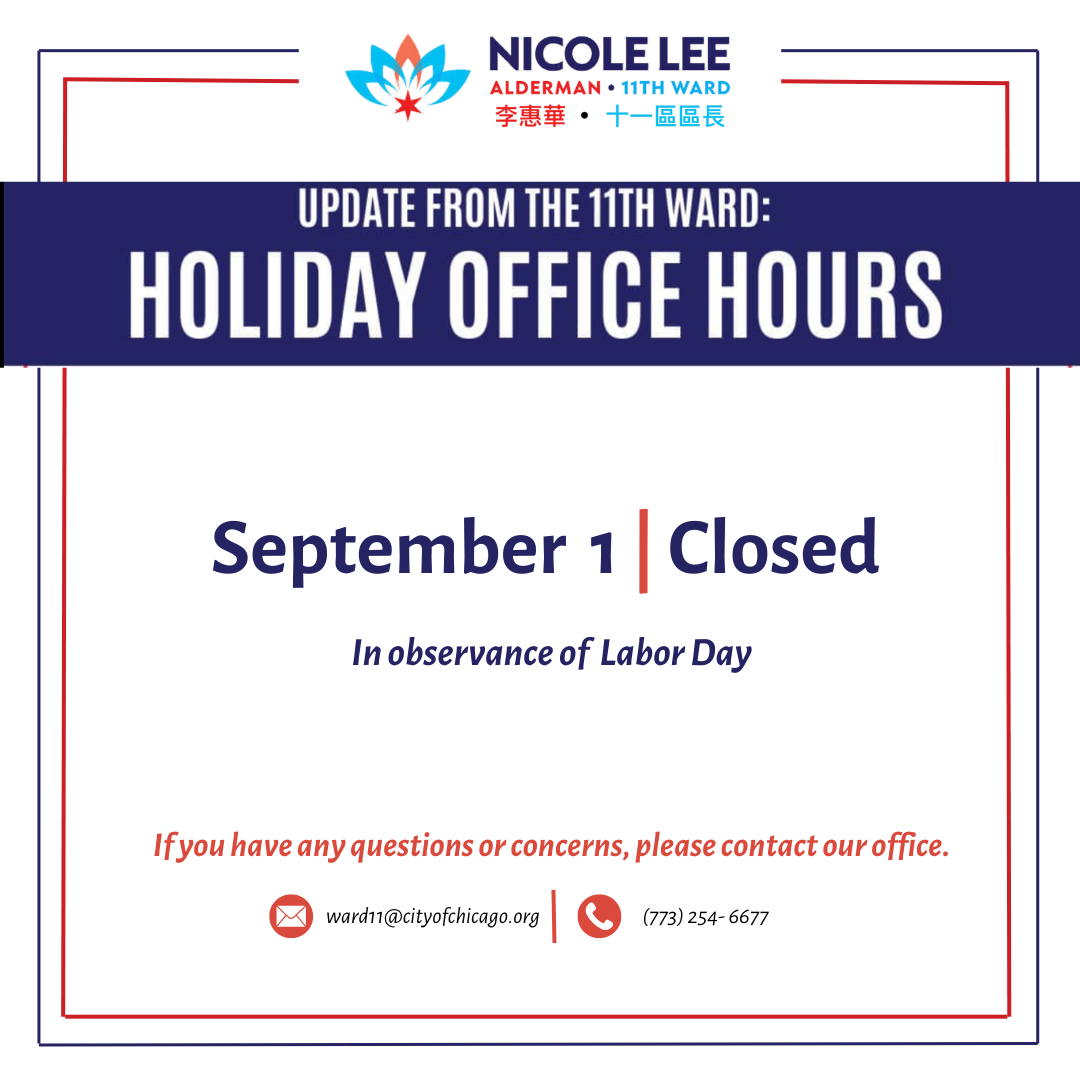 The 11th Ward Office will resume its regular hours starting next week. Don’t forget to take advantage of Ward Night on Mondays.