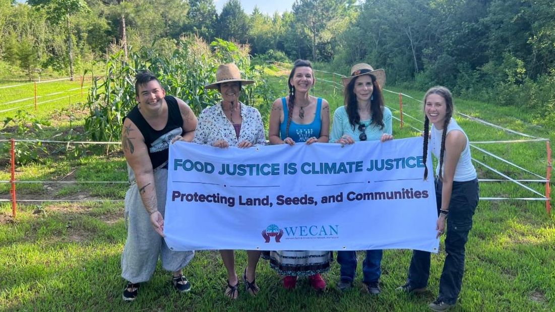 | | WECAN team and Okla Hina Ikhish Holo members hold a banner reading “Food Justice is Climate Justice: Protecting Land, Seeds, and Communities,” in the Gulf South. Photo Credit: WECAN | | |
