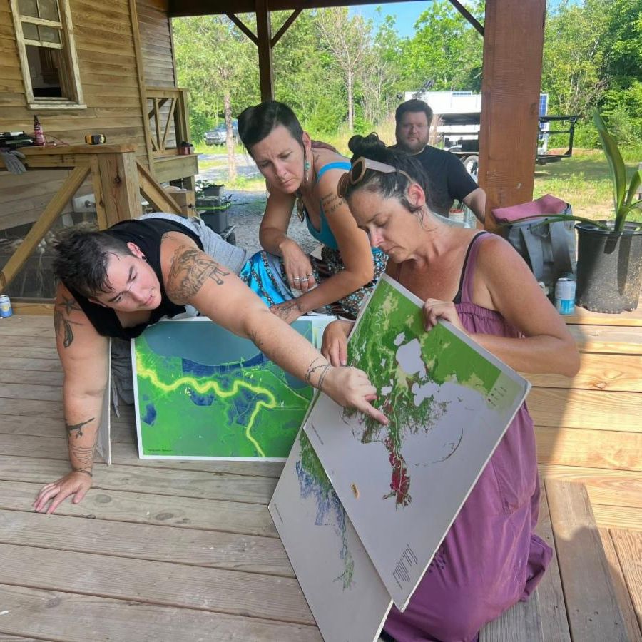 RIGHT: (From right to left) WECAN Okla Hina Ikhish Holo members Ida Aronson, Jenna Mae, and WECAN Gulf South Coordinator, Monique Verdin, present various maps showcasing land loss and fossil fuel extraction throughout the Gulf South. Photo Credit: Sophia Lovato / WECAN