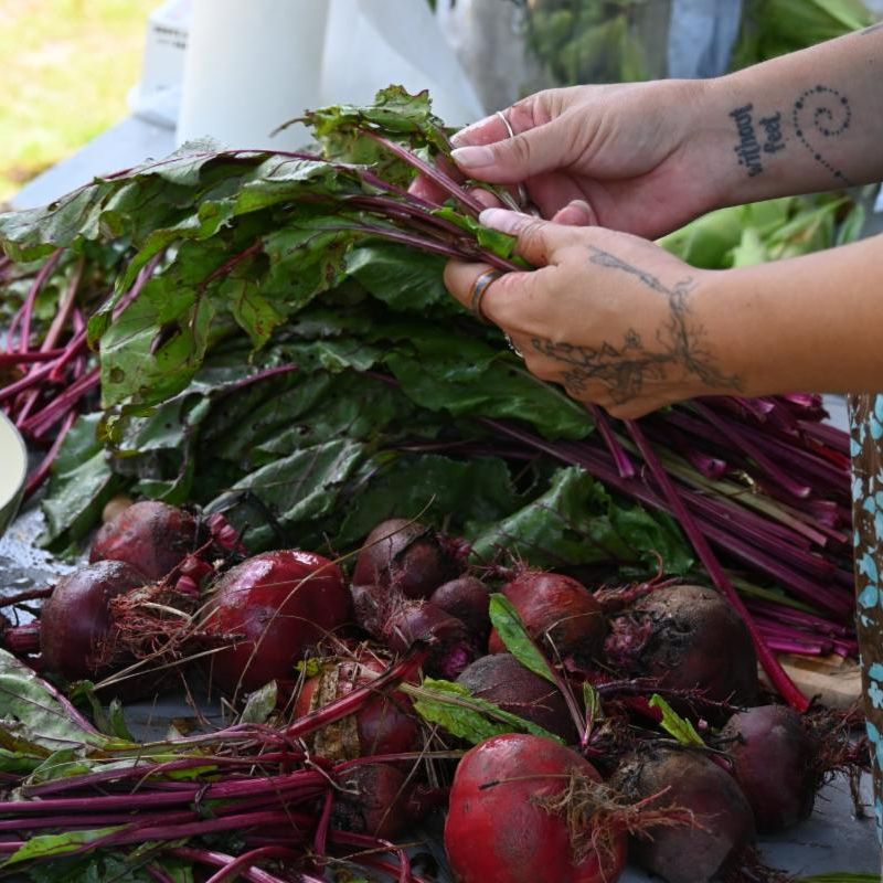 LEFT: Collecting and sorting beets from the Prairie des Femmes farm as part of the Okla Hina Ikhish Holo Project. Photo Credit: Sophia Lovato / WECAN