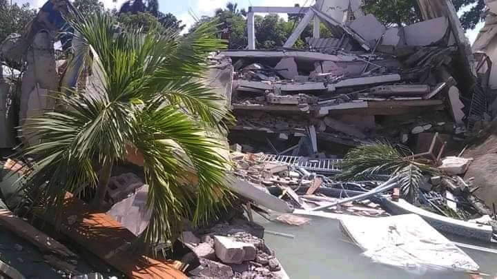 New York Haiti Project - Earthquake Near Martel - A powerful earthquake struck Haiti last month. The epicenter was located about twenty miles west of Martel. Episcopal clergy are reporting that many of the homes, churches and schools in the area were badly damaged. The home pictured here was in Les Cayes. St. Luke's Episcopal Church in Martel was damaged but it can be repaired. As you can see from the photo below, the new addition that we were building was had a bit of a setback. Thankfully there are no reports of people in Martel being hurt or killed. But people are afraid to sleep inside for fear of collapse. Over 300 people are confirmed dead in other communities.