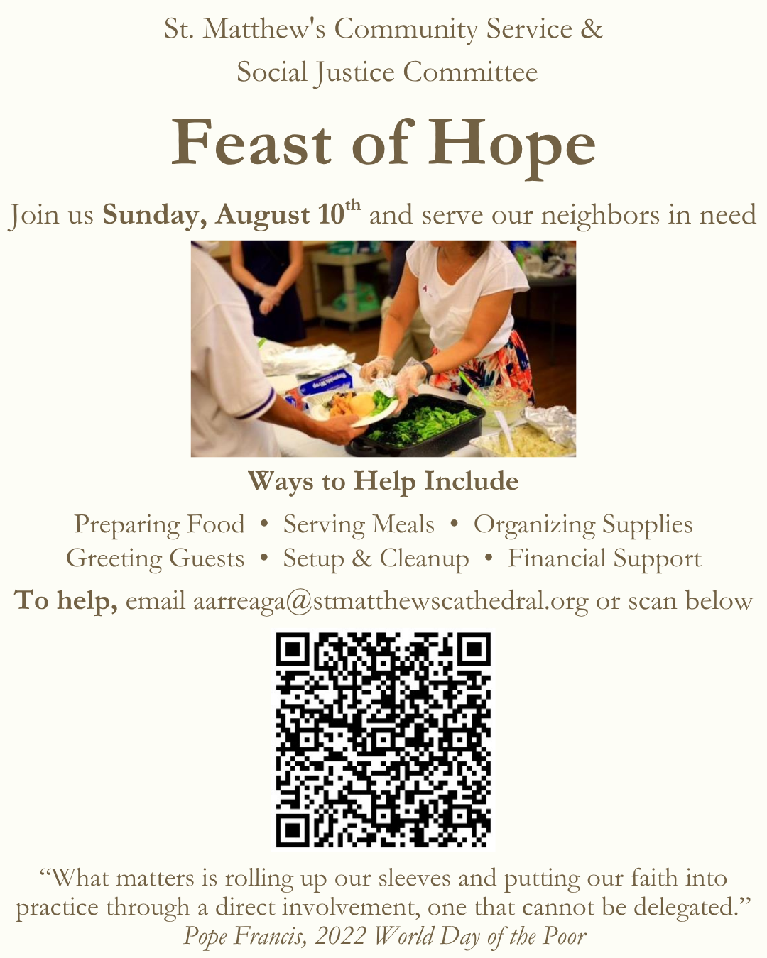 The St. Matthew's Community Service & Social Justice Committee (SJC) is hosting the 2025 Feast of Hope: A Meal for Our Neighbors in Need. In the spirit of Jubilee 2025’s “Pilgrims of Hope,” we will be serving our neighbors who are homeless, hungry, and otherwise in need.