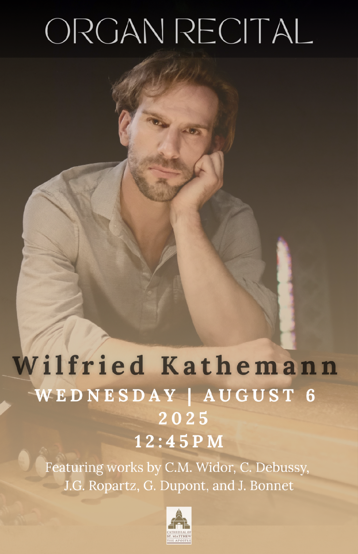 Wednesday, August 6, at 12:45pm, in the Cathedral. The 50-minute concert is free and open to the public. Featuring works by C.M. Widor, C. Debussy, J.G. Ropartz, G. Dupont, and J. Bonnet.