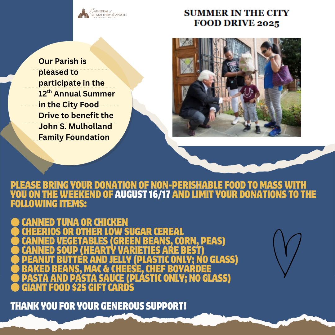 St. Matthew’s is happy to partake in the 12th annual Summer in the City Food Drive, sponsored by the Mulholland Foundation. In order to facilitate bringing in food donations, members of the Social Justice Committee will be distributing bags after all Masses the weekend of August 9/10 at the main entrance of the Cathedral.