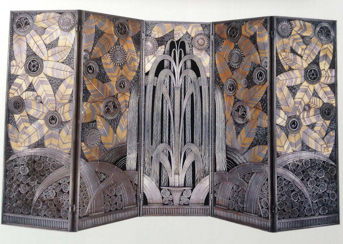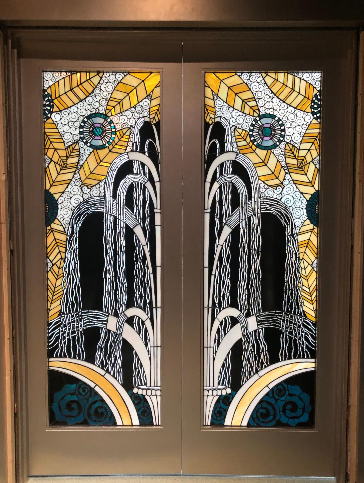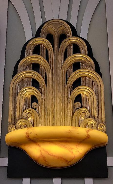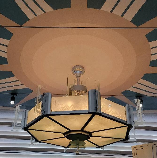 | | Two light sconces with carved wood backs and alabaster bases were purchased several years ago at the Miami antique show from an Argentinian antique dealer. We had them replicated and four of them light up the Deco gallery! | | This stunning large light fixture in the center of the gallery came from a hotel ballroom in northern California. It has a streamlined deco design and dates from after WWII. And yes, its installation was a sight to see! | | The terrazzo flooring in muted colors are reminiscent of the flowing water of a fountain! | | Additional room inspirations were taken from the iron and copper grille called "Oasis" by Edgar Brandt. He designed the ornamental gates at the main entrance of the Paris event. The entry doors to the Deco gallery (right) feature a stain glass design that are reminiscent of Brandt's design at the Expo. | | |