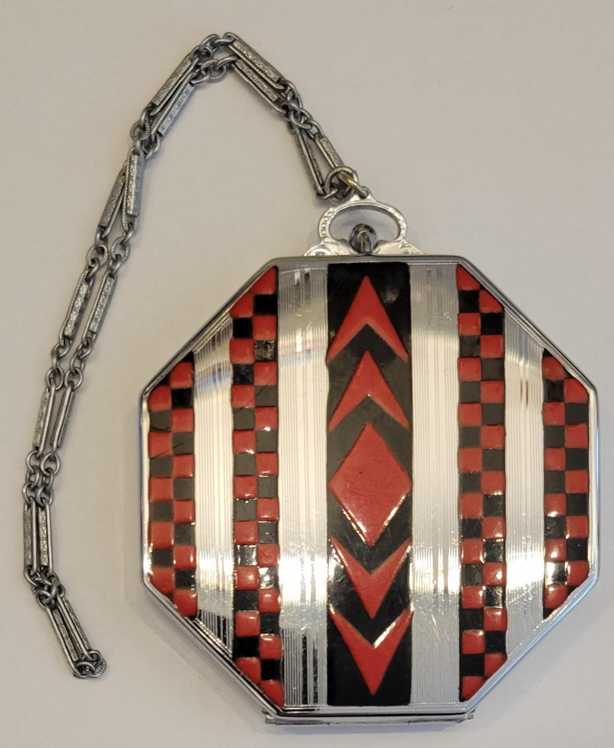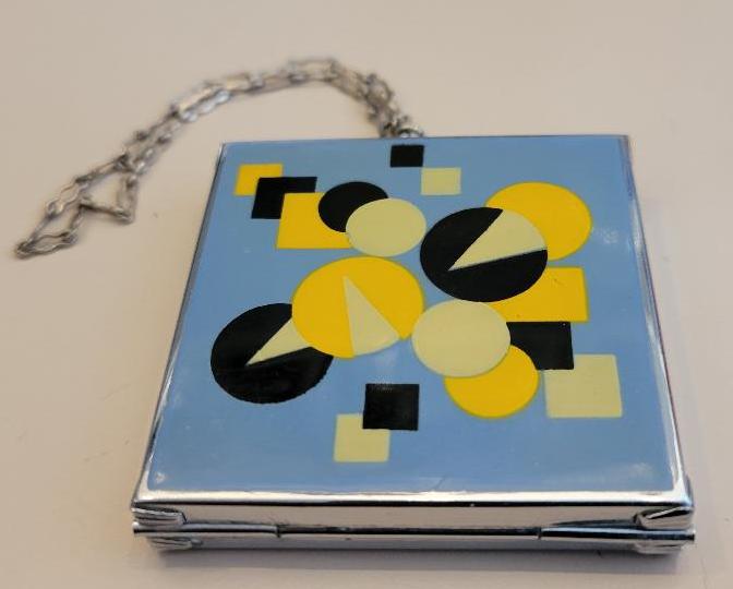 These two Elgin American silverplate compacts have a wonderful enamel deco design. The insides include a mirror with powder and rouge areas. They were featured in a 1930 E.L. Rice company (Detroit) wholesale catalog.