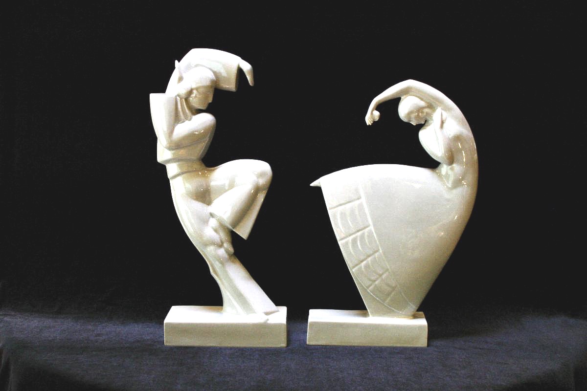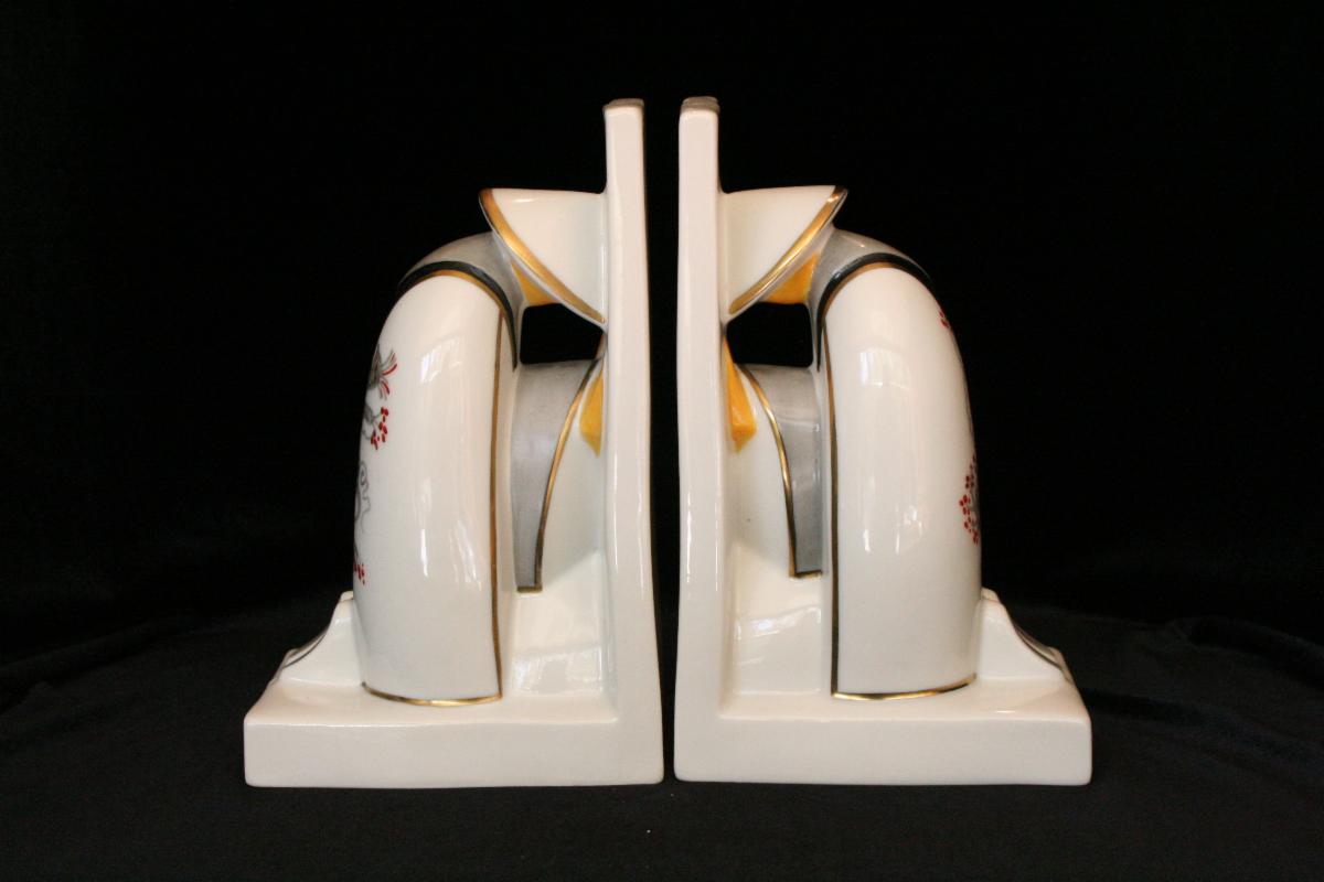The Robj collection on display in the Deco gallery features bookends, inkwells, powder boxes, perfume lamps and other decorative accessories produced by the company. Robj was founded in 1908 by Jean Born who used an anagram of his name for the company.