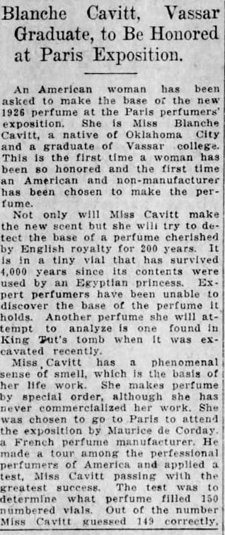 An article in the August 11, 1925 Spokane Washington Chronicle shared the story of Blanche Cavitt, who became the first American, and the first non-manufacturer, selected to create the base for a new perfume at the Expo. The information says that Cavitt has a phenomenal sense of smell which has been the basis of her life's work.