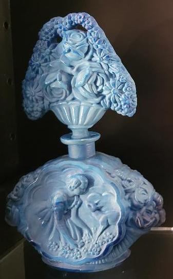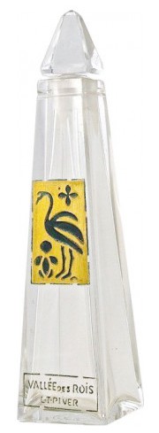 | | Poiret said the names of the three barges--Amours, Delices and Orgues represented women, and were based on the French words that translated to Love, Delights and Organs. | | The Perfume Passage Poiret display includes this bottle that was designed by Poiret and French glass designer Julien Viard to resemble an ink roller. The bottle, created for the Expo, was molded in clear glass and its surface was decorated with Chinese motifs. The glass pebble stopper was adorned with a blue silk tassel. The label reads 1925. | |