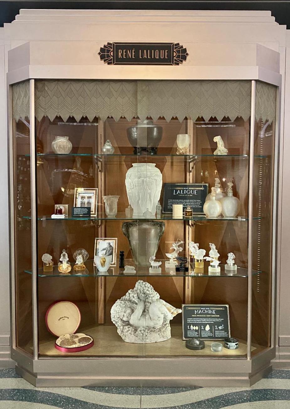 In our gallery, we've included Lalique's fountain designs at either end of the room that are immediately noticeable upon entering, transporting you back to the Paris event! The designs sit atop showcases that feature our Czech and DeVilbiss displays.