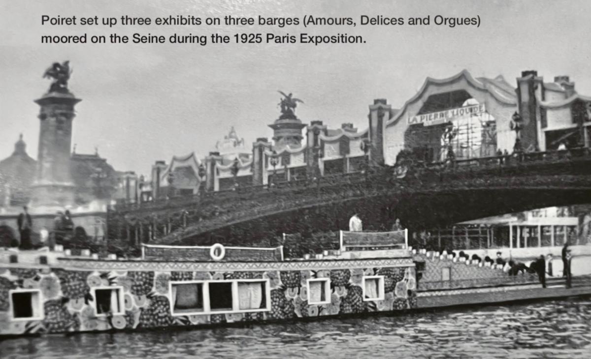In addition to showcasing his couture fashions, textiles and fragrances, two of Paul Poiret's barges at the Expo were opened to the public for teas, dinner and a theater. The third barge (Amours) served as Poiret's personal summer residence, and he slept there during the entire Exposition!