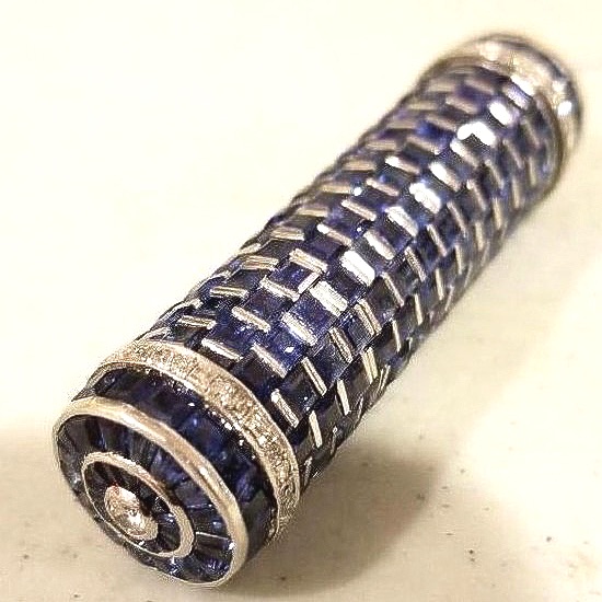 This 1930s French art deco design platinum lipstick case includes rectangle-cut sapphires and diamonds.