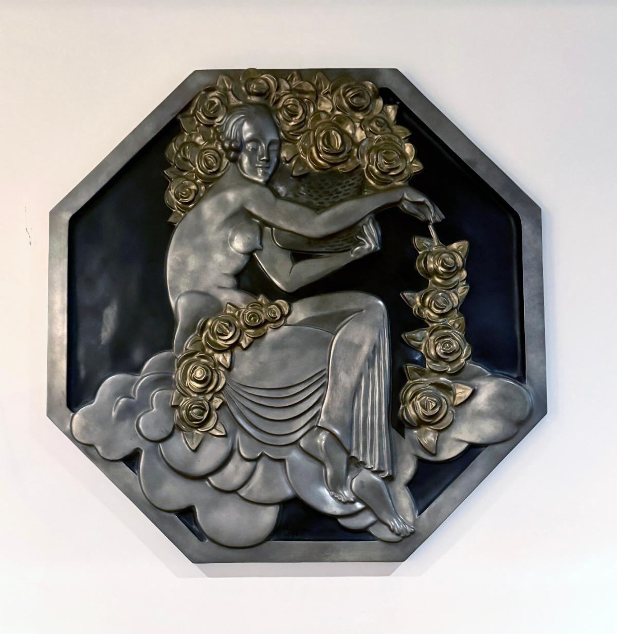 - The large bronze that hangs on the wall at Perfume Passage in the lower level foyer was created by artist Pierre Turin (1891-1968) for the Expo. It measures about 36" and is a sculpted relief of a partially nude goddess and floral on billowing clouds tossing flowers from her basket. Small souvenir medallions with this image, commemorating the Expo, were also produced.