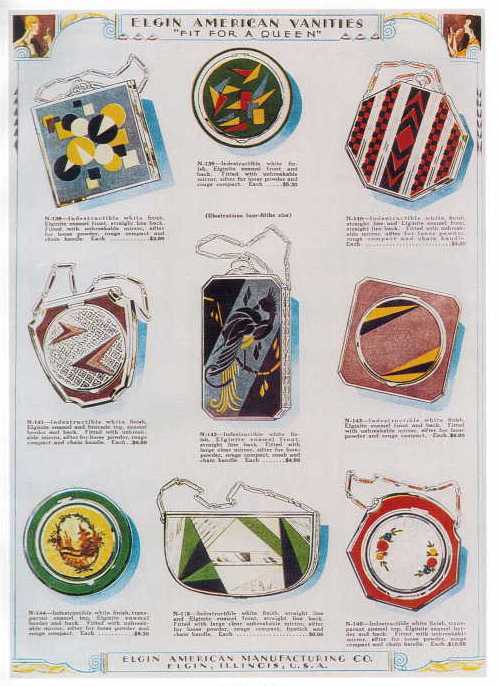 | | Elgin American Manufacturer from Elgin, Illinois, was a leading compact manufacturer in the 1920s-1950s. Their art deco style compacts (below) were popular when produced and extremely collectible today! | | |