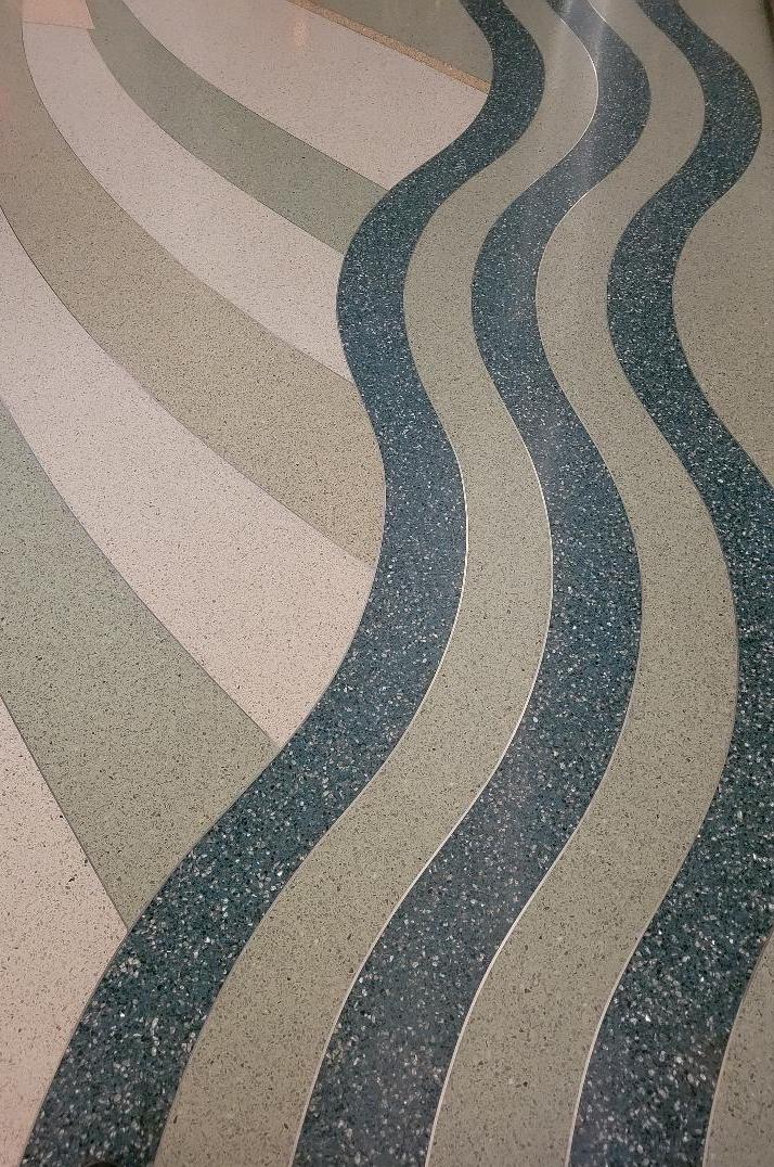 The fountain theme continues throughout the room from the light sconces on the walls to the flowing water design on the terrazzo floor.