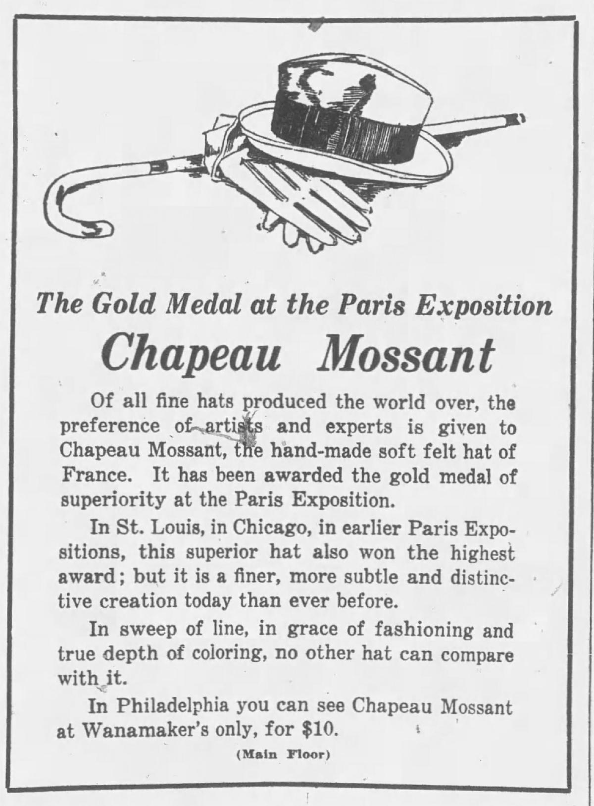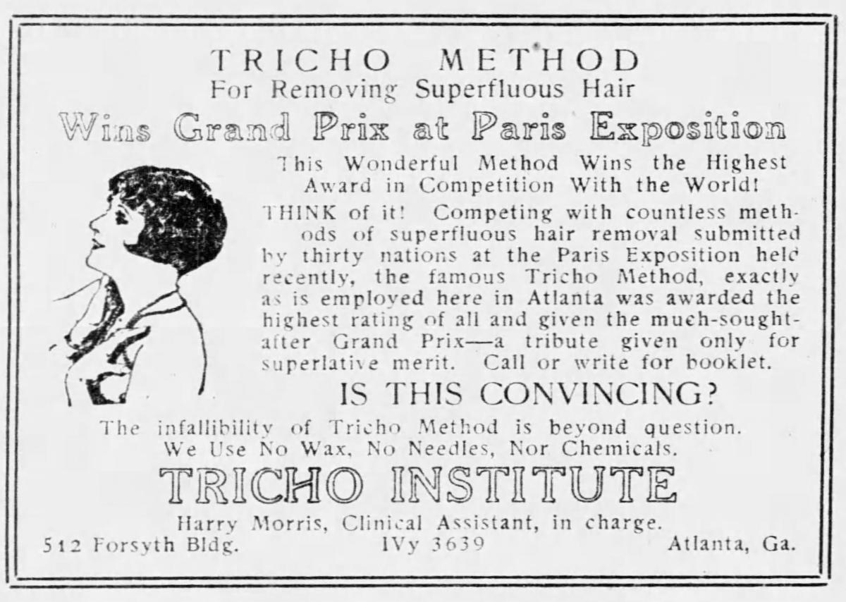 | | The Santa Ana, California Register newspaper from December 8, 1925 included an advertisement from the White Cross Drug Company. They were offering the latest gifts from Paris that included Fioret perfumes, powders and compacts! | | Chapeau Mossant hats were made in Paris, and the hat won a gold medal of superiority at the Expo. This October 5, 1925 ad for Wanamakers department store appeared in the Camden New Jersey Courier newspaper. | | The Tricho Method for "removing superfluous hair" won a Grand Prix award at the Expo according to this December 20, 1925 ad in the Atlanta Constitution newspaper. The ad said the Tricho Institute competed with countless methods of hair removal submitted by 30 nations. Tricho claimed they use no wax, needles or chemicals. It makes you wonder how they won the award... | |