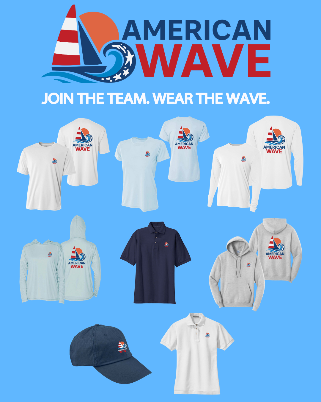We’re SO excited to announce that the official American Wave gear is here! The new line includes performance shirts, lightweight hoodies, polos, hats, and more - designed to keep you comfortable on and off the water while proudly supporting our campaign.