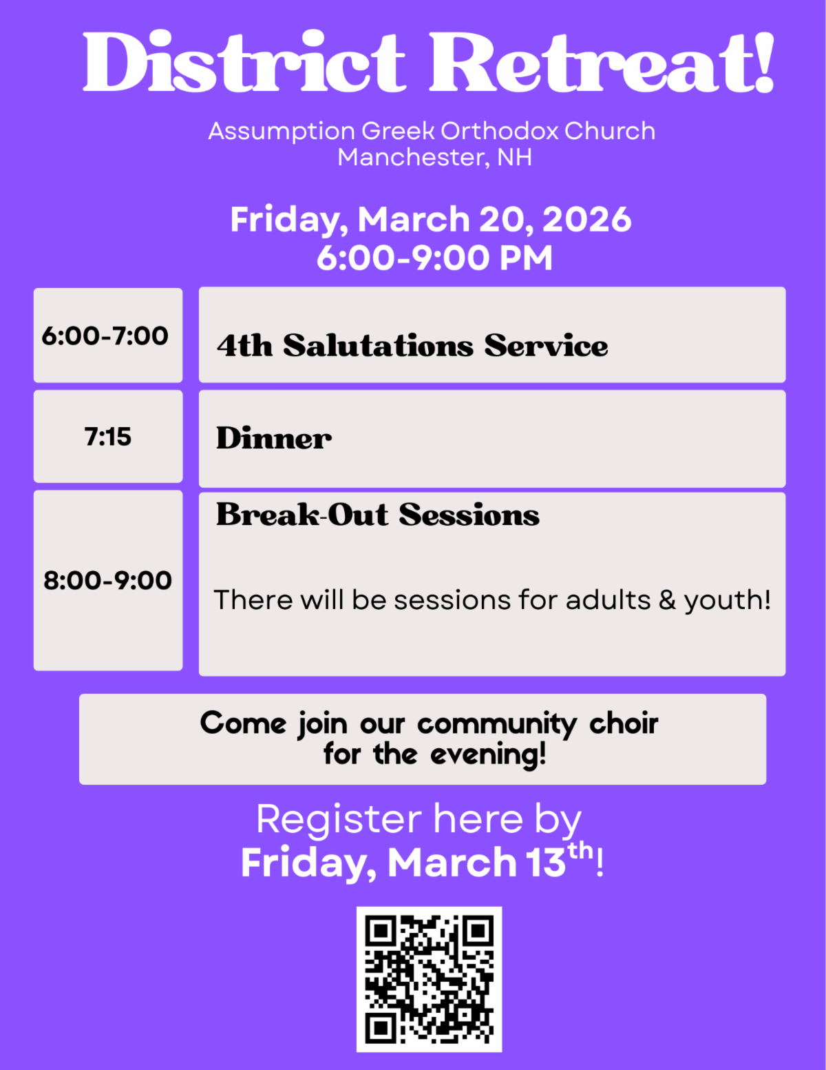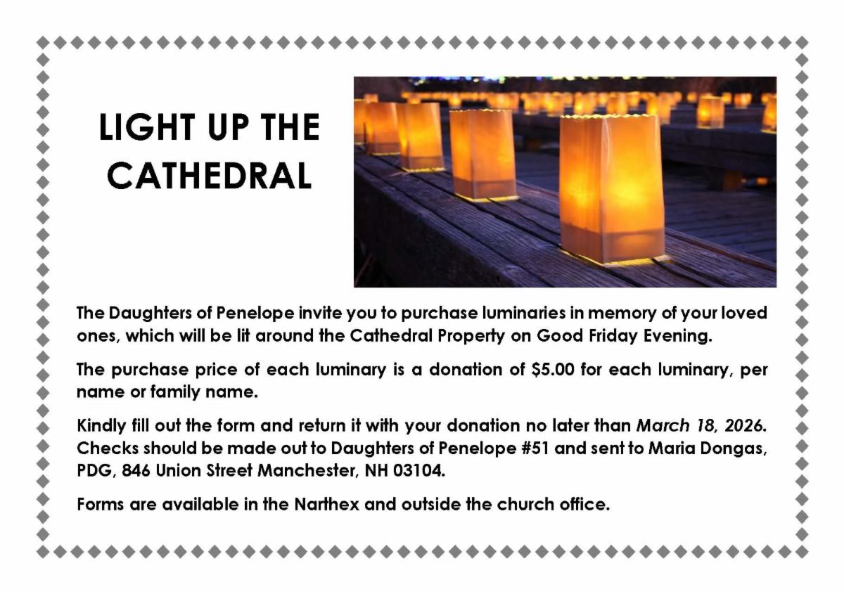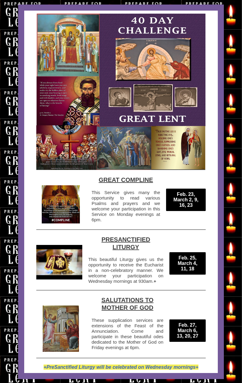 GREAT LENT SERVICES/JOURNEY TO PASCHA FLYER – An information sheet is available in the Narthex with the Great Lent Services on one side and the Journey To Pascha Sunday Services on the other. They are separate from the weekly bulletin to save on printing costs.