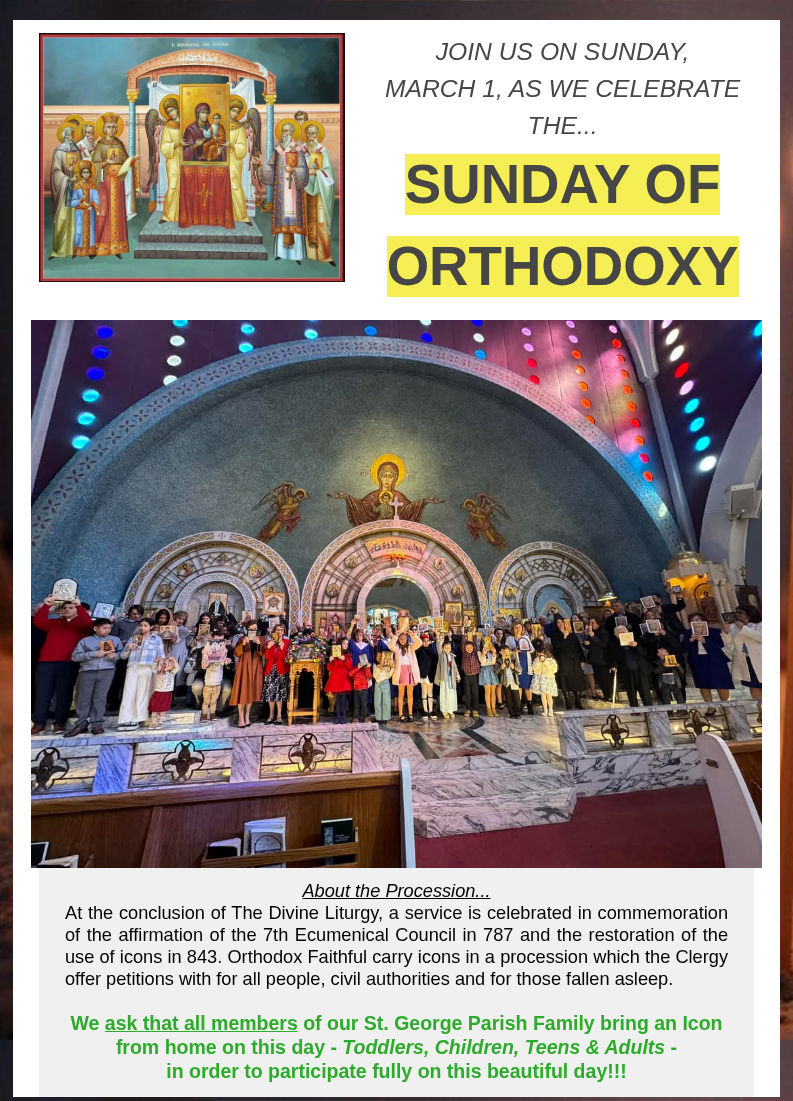 SUNDAY OF ORTHODOXY PROCESSION - We encourage everyone to participate in the indoor Procession of Holy Icons that will take place prior to the completion of The Divine Liturgy. Once the procession and proclamation of the Faith is complete Sunday School students will follow their teachers for a short lesson on this day.