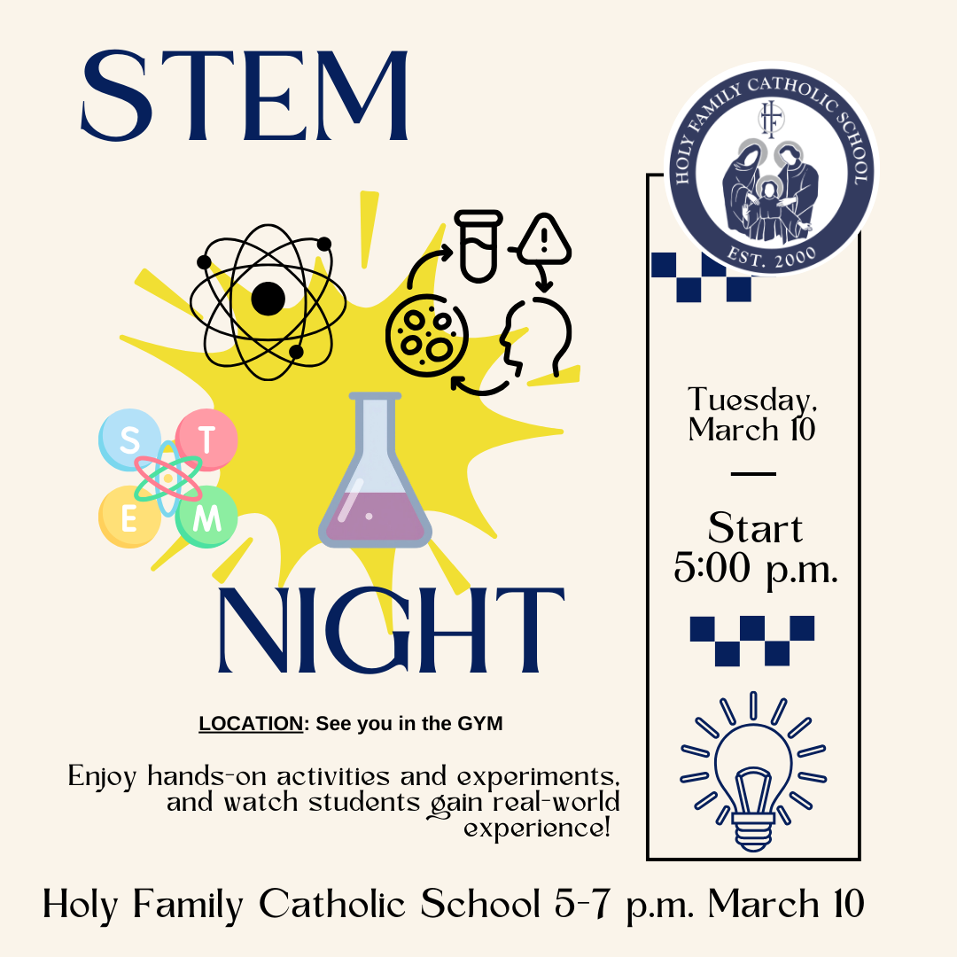| | The Bike Bus program is changing from Wednesdays to Fridays. Please see attached flier and links for more information. | | Holy Family Catholic School is pleased to announce the expansion of our pre-school program beginning with the 2026-2027 academic year. Beginning in the fall, Holy Family will offer PK 3 and PK 4 full-day and half-day options for students. Applications are now open! For more information, please reach out to Mrs. Cammy Nguyen, Director of Admissions, at 512-244-4825 or email her at cnguyen@holyfamilycs.org. | | Attention all STEM enthusiasts! We are looking for individuals who work in the STEM field or have a passion for STEM to have a booth at STEM night on March 10th (5pm-7pm). Booths can include STEM job booths, demo booths or interactive booths. Let us know what you would like to do for your booth and how many tables you would like. For more information contact Ms. Ruiz at sruiz@holyfamilycs.org. Please use the following link to reserve a booth at STEM Night. | | | | |