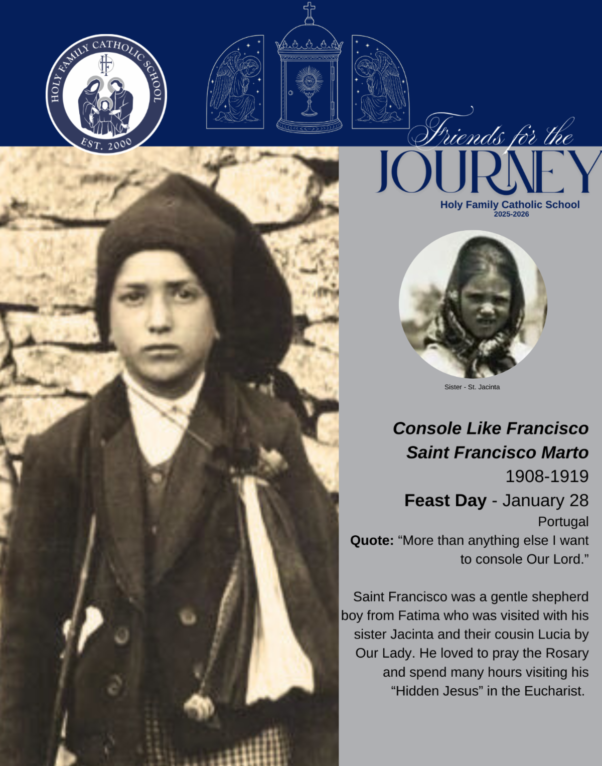 Over 100 years ago, three children were together when a beautiful lady appeared to them and asked them to return to the same spot on the 13th of each month for the next six months. She encouraged the children to learn to read and to pray the rosary for an end to the war and the gift of peace. Today, we know this apparition of Mary to the three children as Our Lady of Fatima, and St. Francisco Marto was one of the children whom Mary visited.