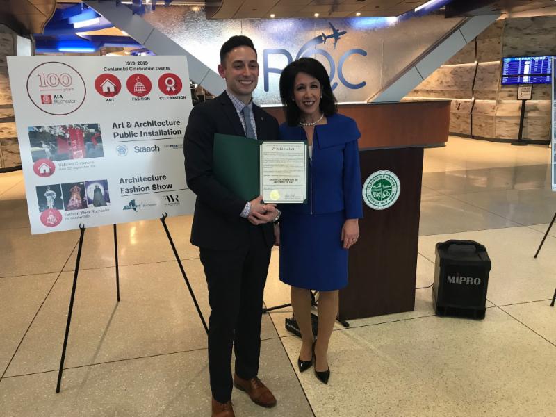 AIA Rochester officially kicked off our 100th year anniversary of professional architects in Rochester with a press conference at the renovated airport on January 23, 2019. AIA Rochester 2019 President Jason Streb, AIA, presented our three main public initiatives: the Installation Competition, the Fashion Week show, and our Centennial-themed Design Awards Gala.   He was joined by Cheryl Dinolfo of Monroe County and Holly   Barrett of the City of Rochester, who proclaimed January 23 to be American Institute of Architects Day and The 100th Anniversary of AIA Rochester in the County and City, respectively.   Dinolfo and   Barrett publicly lauded the architects of our city for the positive contribution we have made in shaping our landscape and our community. Streb was also joined by City Councilmember Elaine Spaull and   Meghan McNamara Mundy, who spoke excitedly of our upcoming Fashion Week collaboration.