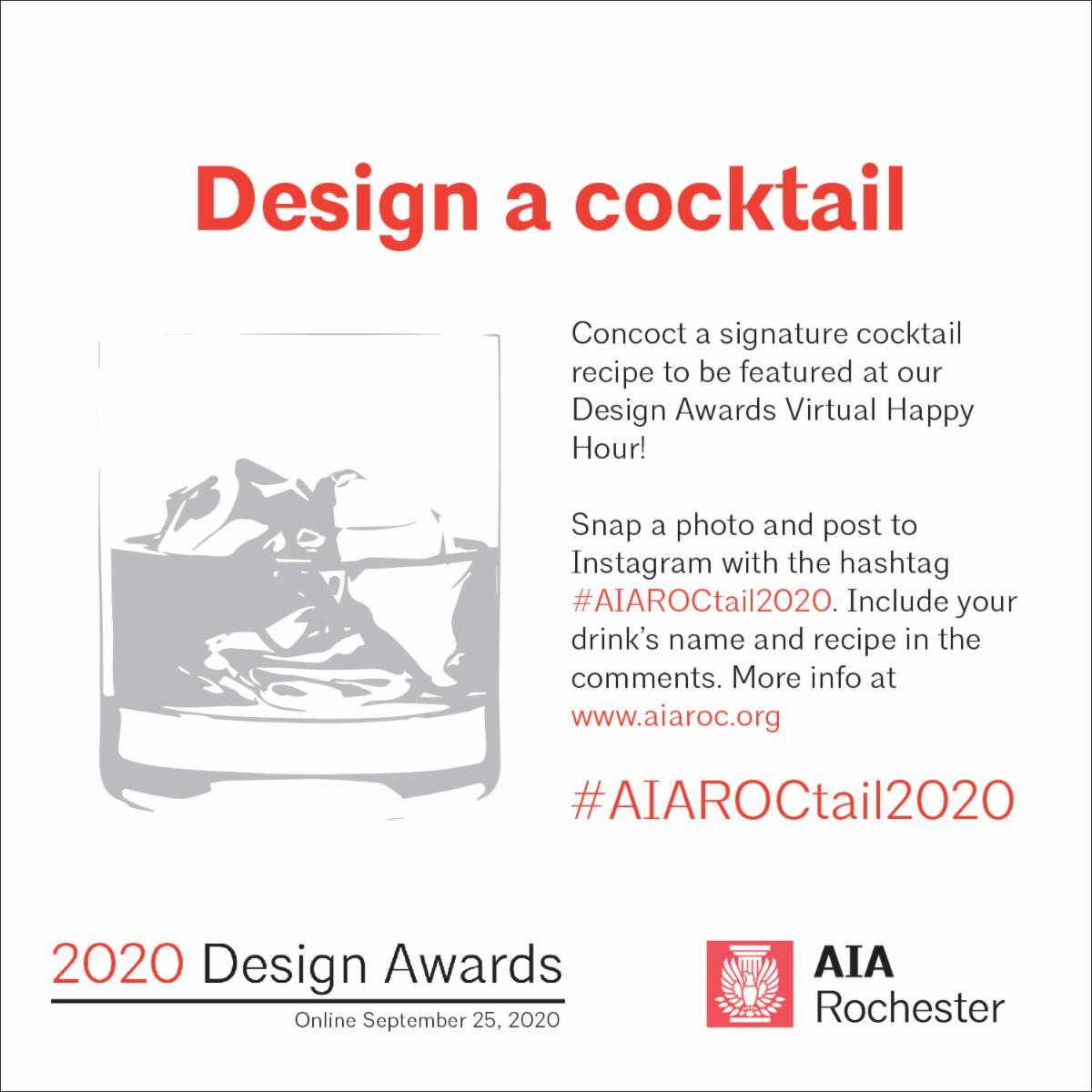 Consider designing your cocktail's name to include 2020 buzzwords such as "pandemic" or "virus," or to address the new sustainability (green!) aspect of our Awards. Snap a photo and post to Instagram with the hashtag #AIAROCtail2020 (be sure your profile is public). Include your drink's name and recipe in the comments. Entries may also be emailed to lbhewitt@aiaroc.org. All entries due by Friday September 18, 2020. Winner receives bragging rights, a certificate, and a prize. Visit https://www.aiaroc.org/2020-design-awards for more information about our Design Awards.