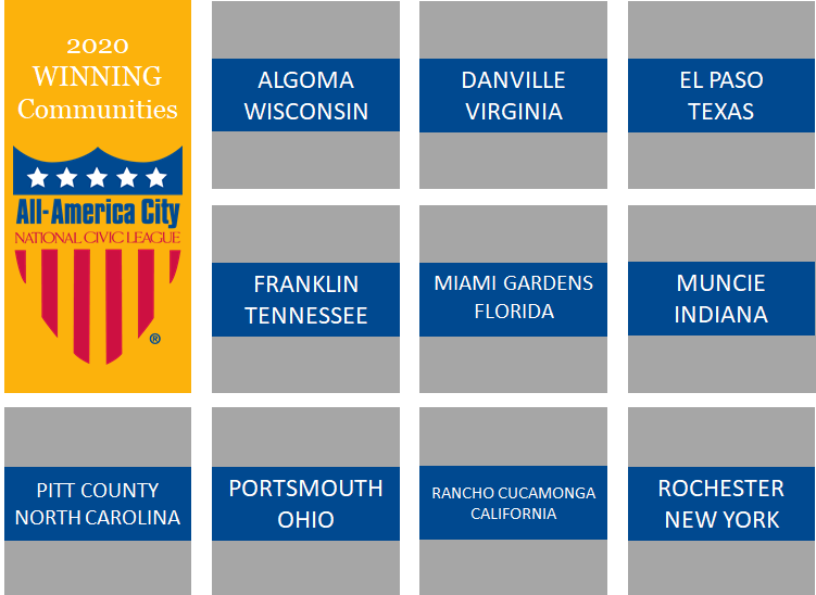 August 19, 2020 – Earlier today, the National Civic League announced the winners of the 2020 All-America City Award (AAC). These 10 communities showed how, through civic engagement and collaboration, they can tackle tough issues and create real change despite a myriad of challenges. Each of the winning communities demonstrated civic engagement practices that are inspirational, inclusive and promising in their ability to unite members of the community to collectively and collaboratively help solve our country’s most pressing and complex issues. This year's winners focused on civic engagement practices that enhance health and well-being in local communities.