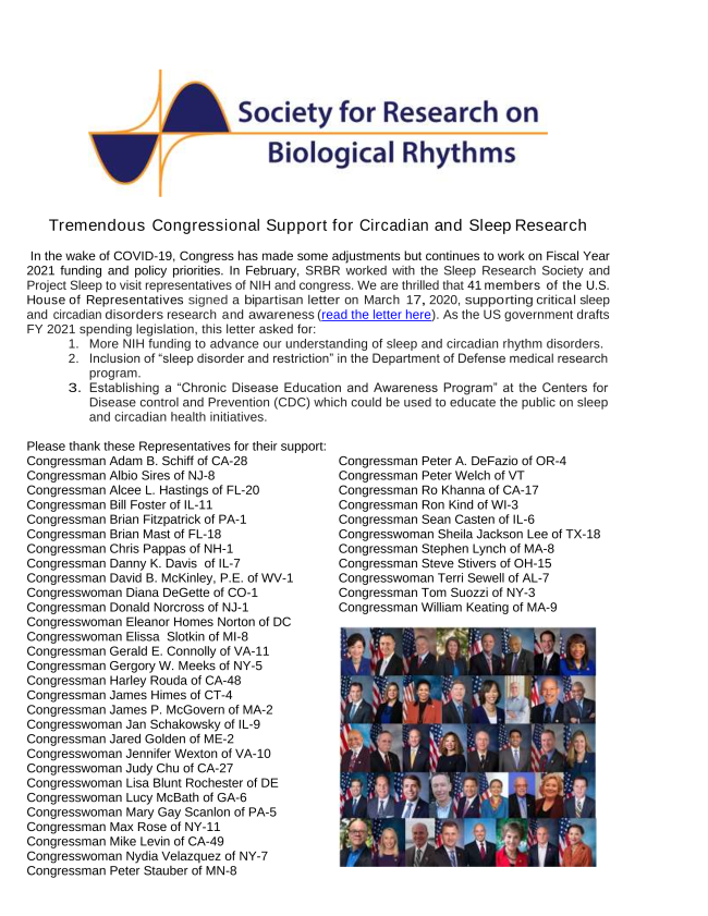 SRBR worked with the Sleep Research Society and Project Sleep to visit representatives of NIH and congress. We are thrilled that 41 membres of the U.S. House of Representatives signed a bipartisan letter on March 17th, 2020, supporting critical sleep and circadian disorcers research and awareness. Please