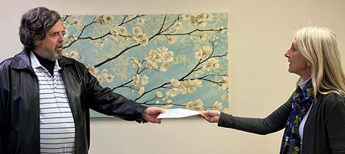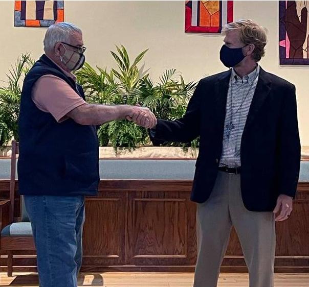 Edd Norris visited Joe Albright at Geneva Presbyterian Church to present Joe with the "Moderator's Cross."