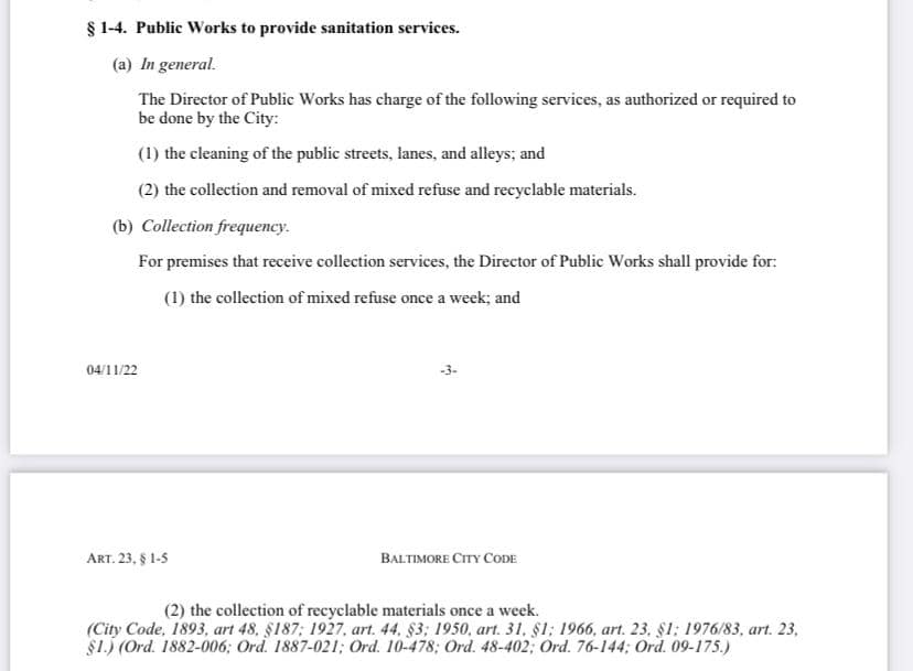 The city code is clear and states that the Director of DPW is obligated to provide weekly collection of mixed refuse and recycling. However, the code uses the term "shall" and not "may," leaving the Director little flexibility to change the frequency of the obligation. Therefore, if the regular collection is not done every week, the Director violates a non-modifiable requirement and therefore violates the Baltimore City code.