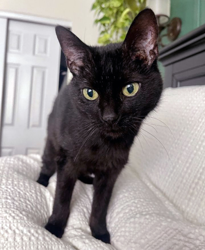 Jujube is a sleek 5-year-old black girl with beautiful green eyes. She came to us malnourished at only 5.4 lbs., with a bad case of fleas and minimal fur as a result of the flea dermatitis. She is now a healthy 8.4 pounds with a gorgeous black fur coat. She loves food! She will even sneak a bite when you are not looking.