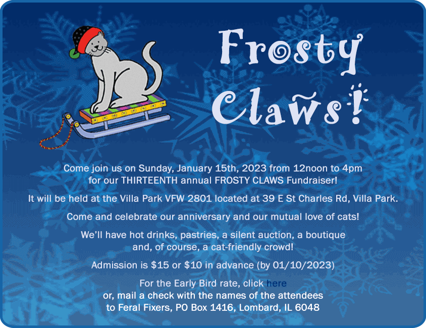 January 15, 2023 - The return of Frosty Claws! - We are working on 2023 Frosty Claws! Sunday, January 15th, 12 noon to 4pm at the Villa Park VFW, 39 East St. Charles Rd, Villa Park. An open house with food, cat people, fundraisers, boutique and information, we are so glad to be able to return to these events! If you would like to donate to the Silent Auction or Door Prizes, notify Tammy at tnr.tammy@yahoo.com – receipt of donations needs to be ASAP – takes time to create! More details, including how to purchase Early-Bird special rate tickets, can be found elsewhere in this newsletter. Look forward to seeing you ALL!