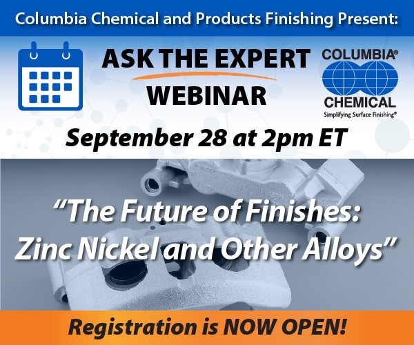 Columbia Chemical is excited to partner with Products Finishing to offer you our next free webinar: The Future of Finishes: Zinc Nickel and Other Alloys. Manufacturers and suppliers need to readily adapt to new substrates and finishes to meet evolving OEM needs. This presentation will cover various zinc alloy processes available, keying in heavily on zinc-nickel and the properties that make it appealing to manufacturers—specifically within the fastener, casting, automotive and heavy equipment industries. Columbia Chemical will examine trends and technologies relative to the electric vehicle market and explore the growing automotive interest in tin zinc. Applicators, OEMs, Tier suppliers and engineers alike will benefit from this presentation as they provide information focused on coating corrosion resistance and durability and present an overview of trivalent passivate finish options relative to color, corrosion protection and considerations related to bake requirements and torque tension. |