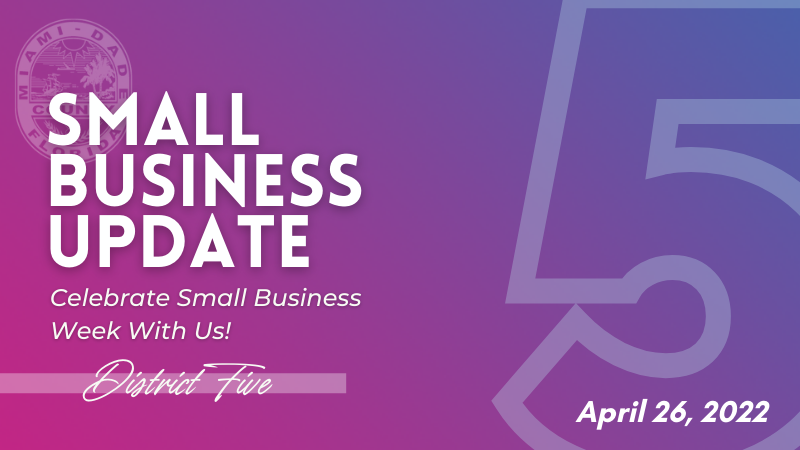 As April comes to a close, we are gearing up to celebrate National Small Business Week in District 5 from May 2 to May 6. You can't believe how excited I am to be partnering with local and national organizations, Miami-Dade County departments, and small business resource providers to offer a full calendar of events for our small businesses, as well as new (and well-known) programs and funding opportunities. Learn how you too can participate by reading below or clicking here to see our calendar of events.