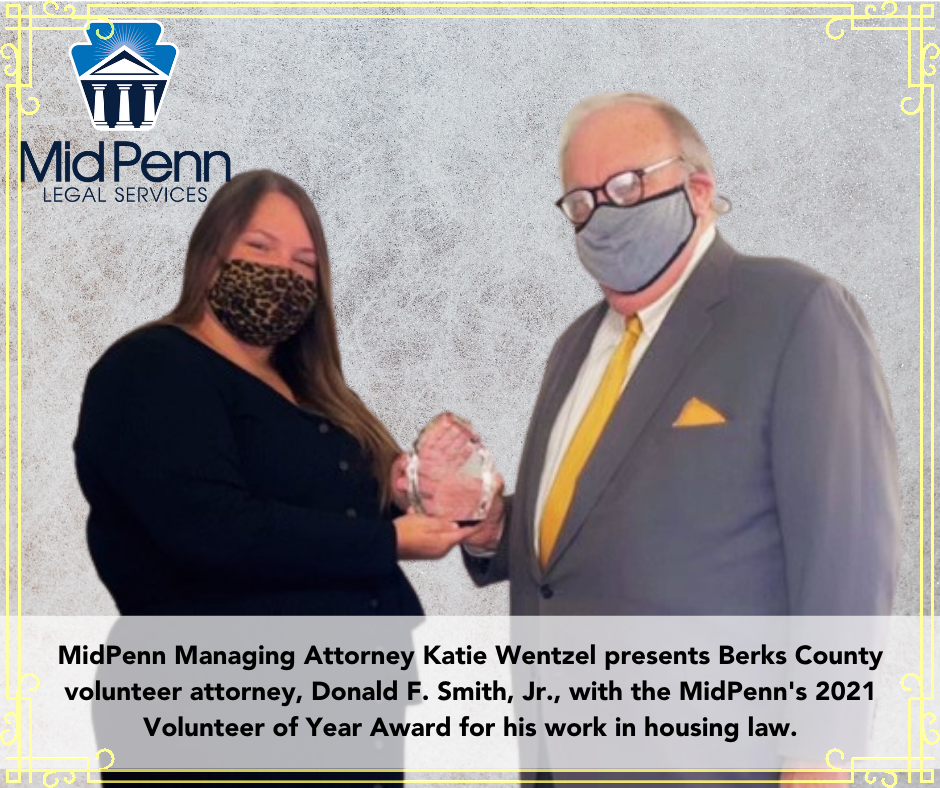 Access to Justice: Berks County Attorney Donald F. Smith, Jr., received the 2021 Volunteer of the Year Award at MidPenn's Access to Justice event on September 22, 2021. The award was in recognition of the extraordinary work Attorney Smith has done in the area of housing law. The virtual celebration honored members of the legal profession who have made significant contributions toward achieving Equal Justice for all members of our community. The law firm of McNees, Wallace & Nurick has received the 2021 Law Firm Award for their outstanding pro bono commitment and support of MidPenn's mission. Kay Pickering from the Harrisburg Center for Peace and Justice was presented the Volunteer Award for her collaborative work with MidPenn advocates. The Honorable Judge Carolyn H. Nichols was the keynotes speaker.