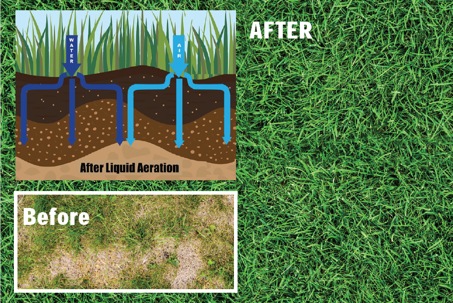 Lawn aeration is the process of opening holes, tunnels or breaks in the soil to allow air, water and nutrients to pass down to lower areas of the lawn’s root system. Most clay soils need aeration service to relieve soil compaction that has been built up from traffic, mowing or rain/snow fall. When soil compaction is present you will be able to see standing water in spots of the lawn after irrigation or rainfall. You may also see dry spots or browning areas because the water has not penetrated the soil surface and was mostly evaporated into the air.
