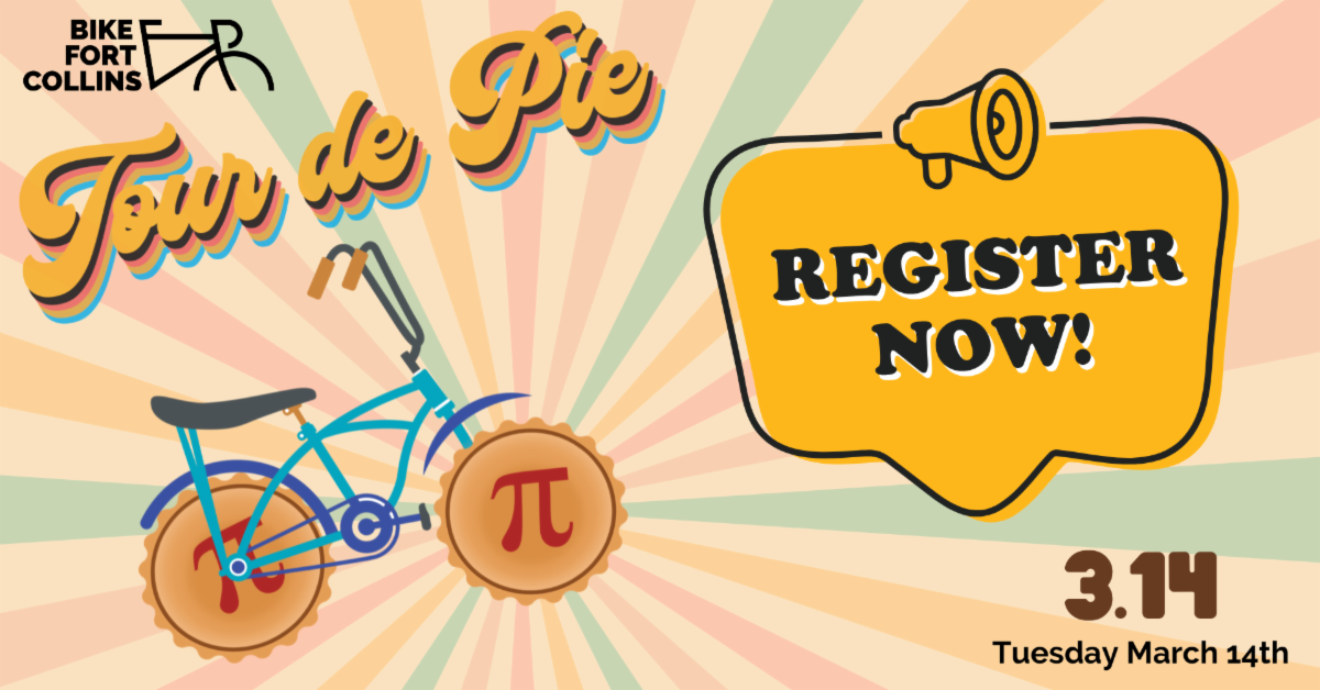 Our annual Tour de Pi(e) Ride will take place on Tuesday, March 14th (3.14). Beginning at Retreat Bakery, the casual, no-drop ride will include three stops for pie premier Fort Collins pie and pizza (pie) makers: Retreat Bakery, 80's Pizza, and Rise and Pie. We'll end at Purpose Brewing & Cellars, who is graciously opening just for us that evening.