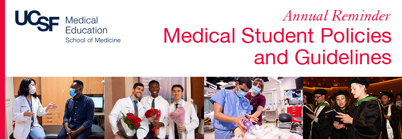 As we move toward the start of a new calendar year, we want to thank you for all that you collectively do to make UCSF a positive, welcoming, and safe environment for all. We would like to remind you where you can find the Medical Student Policies and Guidelines that the School of Medicine uses to oversee its operations. These policies help guide our education mission to graduate learners who will improve the health of our patients and communities.