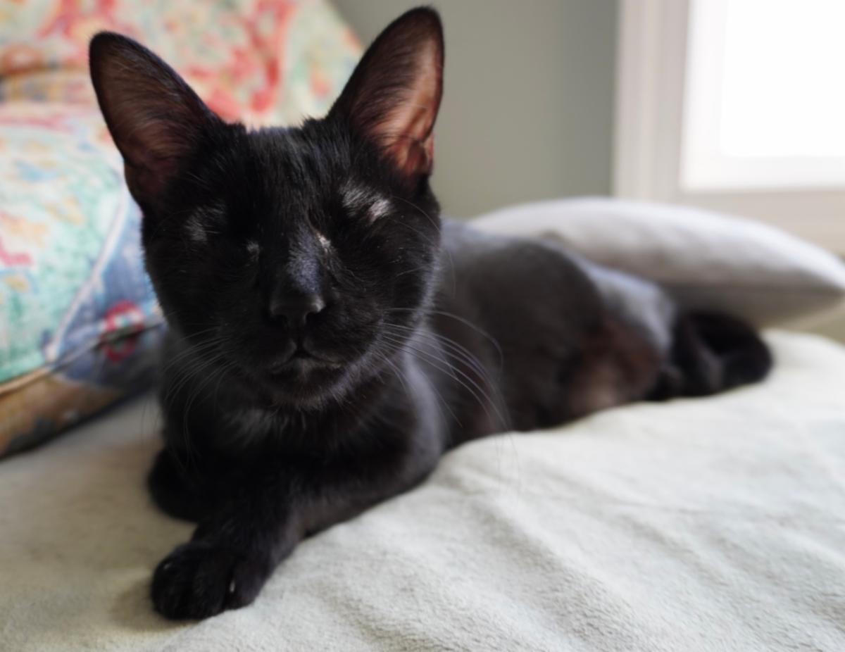 Biscuit was found among a colony of stray cats in the community by a kind woman who noticed she had seriously infected eyes. Concerned about the kitten, the woman contacted CARE to see if CARE could help. Without hesitation, CARE agreed to take the kitten and contacted their vet partner to have Biscuit seen right away. The vet, seeing how serious the condition was, immediately prepared Biscuit for surgery to have both her eyes removed. Within a couple of days, Biscuit was already exploring with curiosity, seeking affection and learning to navigate her way around. Biscuit's bold and confident demeanor was amazing to observe as she learned to climb up and down the bed, navigate her way to the top of the cat tower and ascend and descend the stairs. Biscuit learned to play, using her keen sense of hearing to find her toys, food and litter box. Biscuit is an easy cat to fall in love with and soon her lucky forever family adopted her. Once again, Biscuit's new family was amazed to see how quickly she adapted. She lives in a home with her mom, dad and two dog siblings who have learned that Biscuit rules! None of this would have been possible without the loyal support of our dedicated donors.